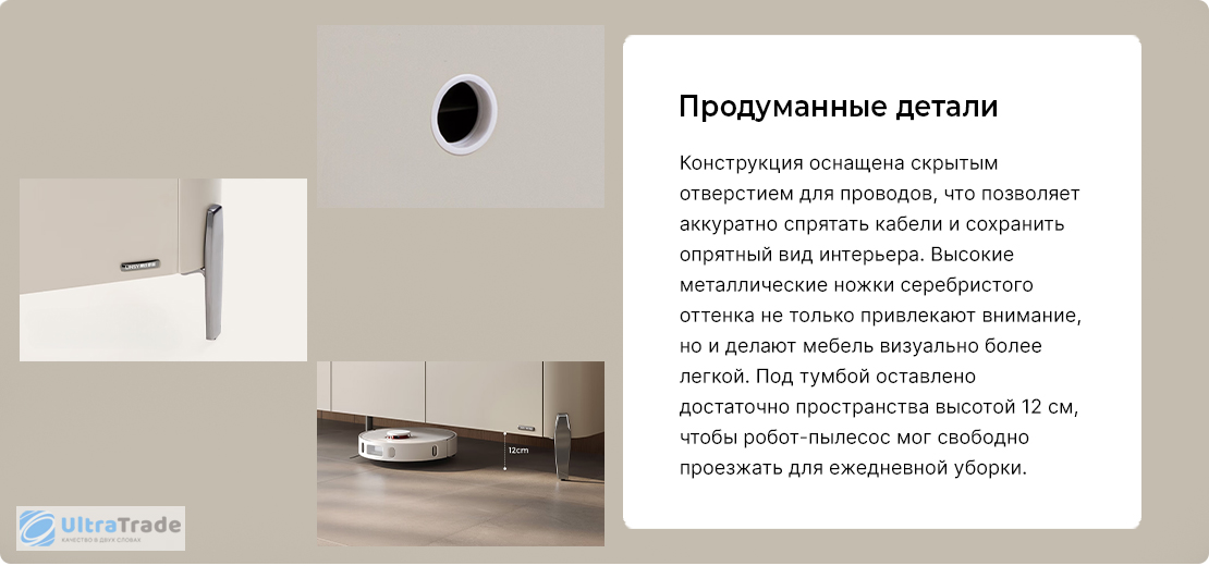 Глубина столешницы составляет 40 см, она обеспечивает достаточно места для размещения декора, техники и аксессуаров. На такой поверхности можно свободно расставить рамки с фотографиями, вазы, аудиосистему без ощущения тесноты.