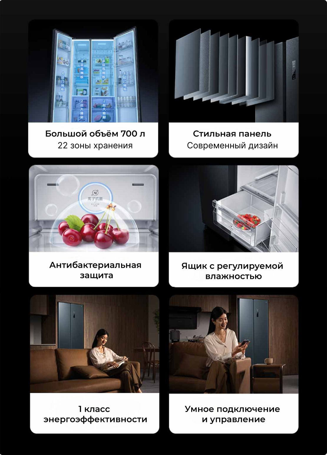 Холодильник работает на двух инверторах: компрессор и вентилятор плавно подстраивают температуру под нужды продуктов — не резко, а точно. Встроенные датчики постоянно следят за теплом внутри и корректируют режим — поэтому еда не портится от перепадов, а остаётся свежей дольше.