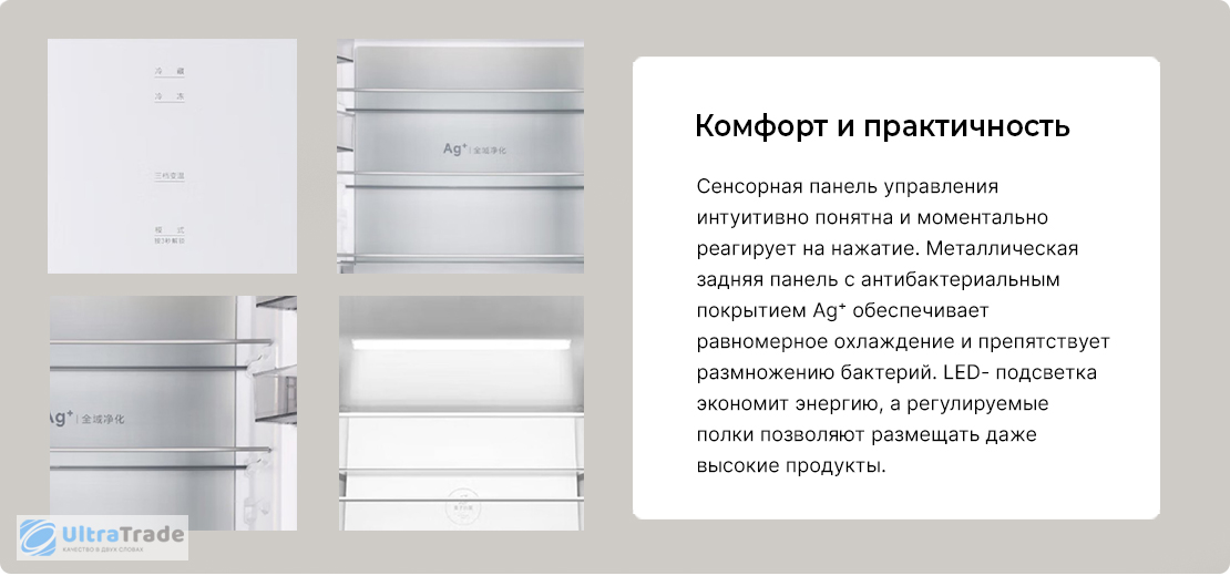 Технология ионной стерилизации Внутри холодильника работает интеллектуальный модуль с ионами серебра, который эффективно устраняет неприятные запахи и уничтожает до 99,99% бактерий в холодильной камере и до 95% — в морозильной. Продукты остаются свежими, чистыми и безопасными. ![]() |