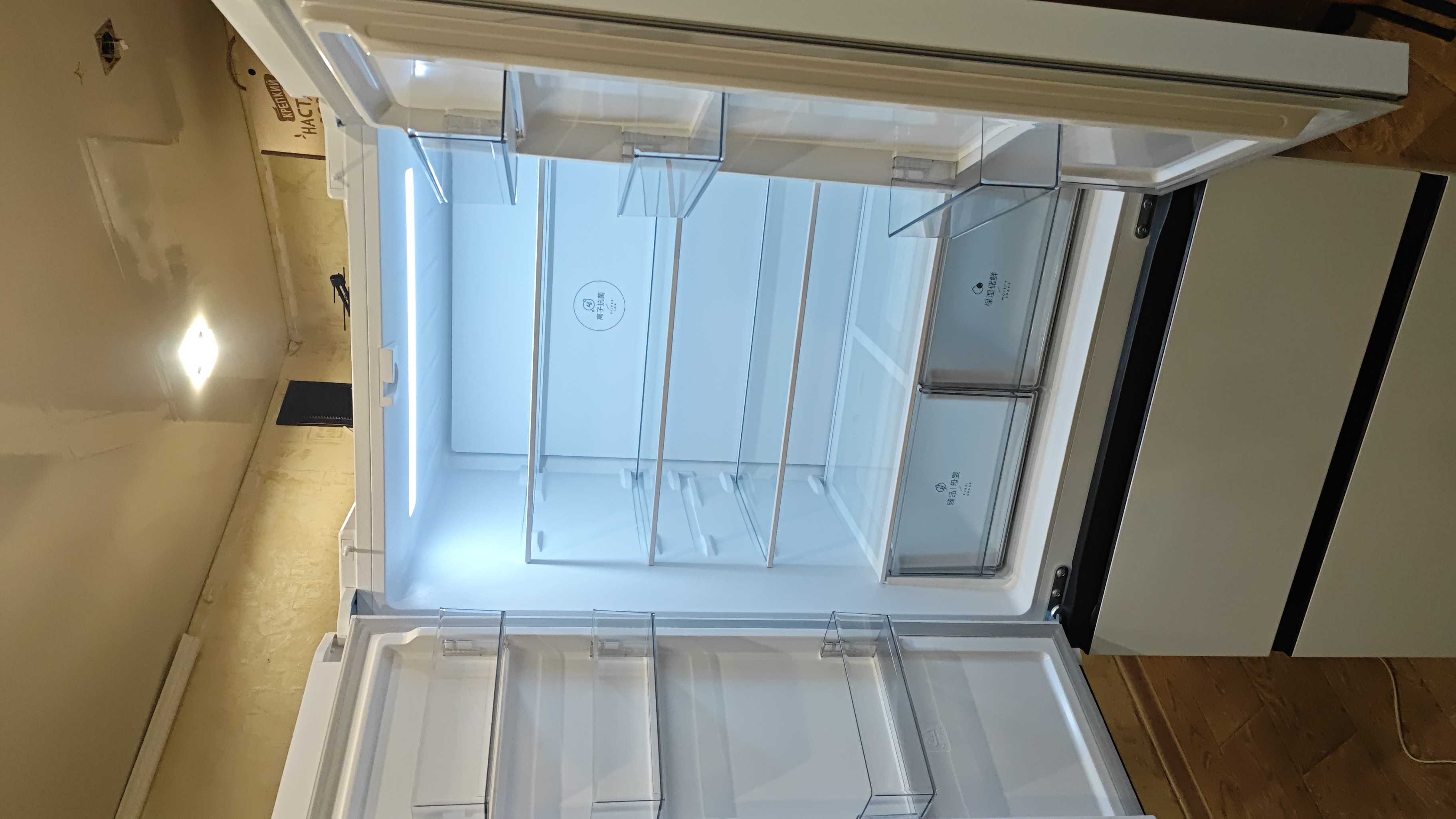 Не скажу, что долго, но пришлось привыкать к новому расположению дверок и способу их открытия. При открытии правой двери, левую дверь открывать строго снизу, но по началу рука сама тянется взять её по середине, делать этого не стоит. Как и заявлено для полного открытия дверок достаточно очень маленького зазора. Нижние выкатные отделения морозильника очень удобные и вместительные (подсветки в них нет), выкатываются легко.