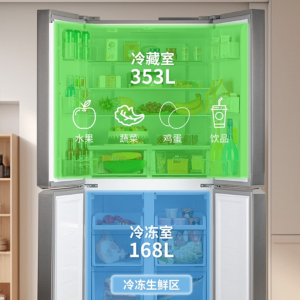 Холодильник объёмом 521 литр предлагает продуманное распределение зон: 353 литра холодильной камеры и 168 литров морозильной. Такое сочетание позволяет хранить продукты в комфортных условиях, ваши блюда надолго остаются по-настоящему ароматными и вкусными.