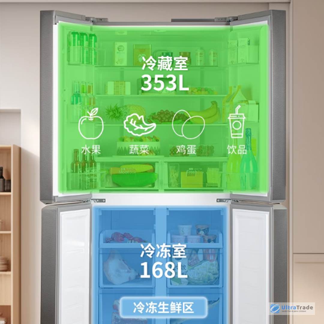 Холодильник объёмом 521 литр предлагает продуманное распределение зон: 353 литра холодильной камеры и 168 литров морозильной. Такое сочетание позволяет хранить продукты в комфортных условиях, ваши блюда надолго остаются по-настоящему ароматными и вкусными.