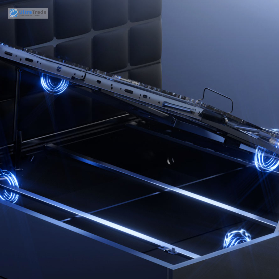 Кровать оснащена четырьмя электромоторами для плавной и стабильной работы: два отвечают за подъем спальной платформы, два — за открывание отделения для хранения. Мощные моторы обеспечивают тягу до 4000 Н каждый и работают с минимальным шумом — до 45 дБ.