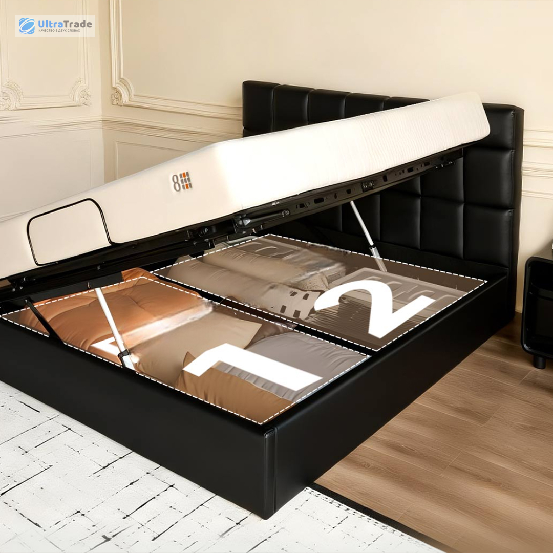 Благодаря боковому способу открывания доступ к содержимому осуществляется по всей длине кровати. Это позволяет легко дотянуться до любой вещи без необходимости залезать внутрь. Кроме того, конструкция с отсутствием традиционного пространства под кроватью облегчает уборку и предотвращает скопление пыли.