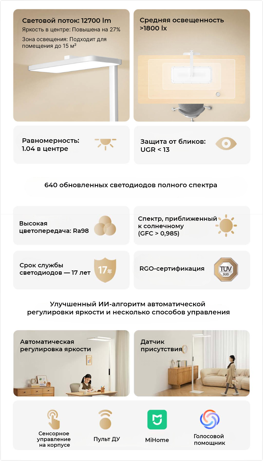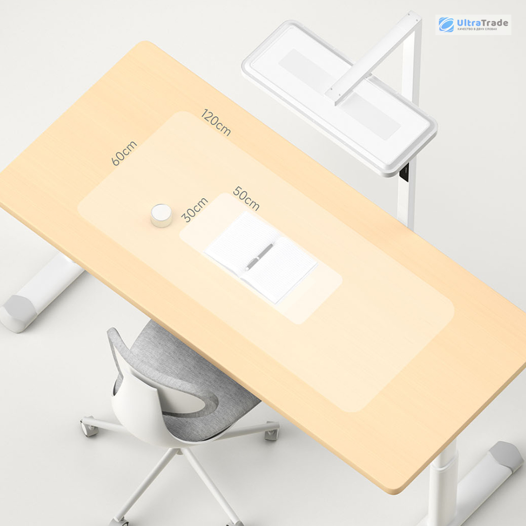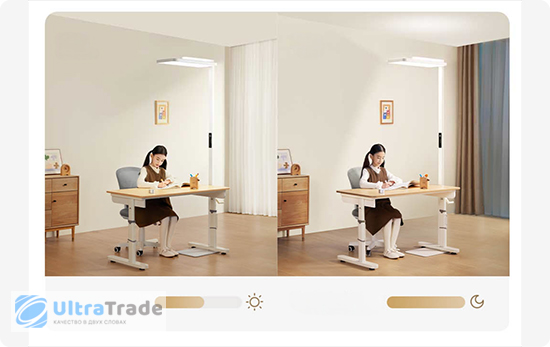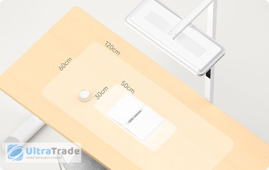 Двухуровневая система освещения Лампа использует двухуровневую систему освещения: верхний и нижний источники света работают вместе, создавая объёмное, мягкое освещение без резких теней. Благодаря 384 специально расположенным светодиодам и 360°- рассеиванию свет равномерно отражается от потолка и стен, охватывая всё помещение — до 15 м². Общая яркость достигает 12 700 лм, при этом уровень дискомфорта от бликов (UGR) остаётся ниже 13 — свет почти не слепит, даже при длительном использовании. Такой подход снижает контраст между рабочей поверхностью и окружающим пространством, защищая зрение ребёнка во время учёбы. |