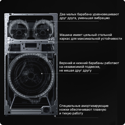 Стабильная и тихая работа Машина работает плавно и тихо даже при одновременной работе трёх барабанов благодаря цельному стальному каркасу и усиленной системе амортизации. Интеллектуальная стабилизация анализирует отжим в реальном времени, снижая вибрацию и шум. ![]() |