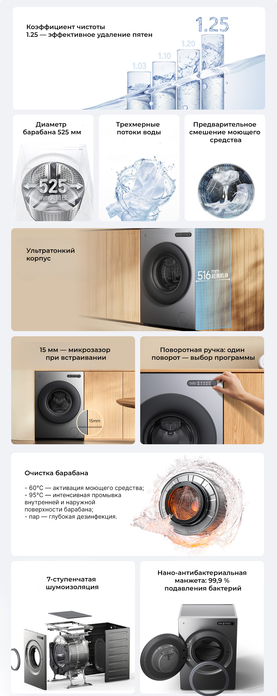 Снижение шума Семь конструктивных решений работают вместе для снижения вибрации и звуков: резиновое уплотнение двери, цельнолитой корпус, усиленная верхняя крышка, демпфирующие ножки с высоким сцеплением, ребра жесткости, балансировочный блок и текстурированные боковые стенки, поглощающие резонанс. ![]() |