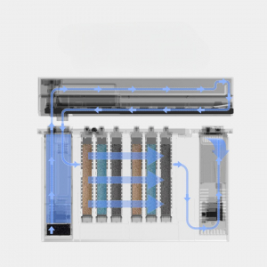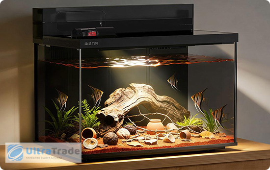 Аквариум использует 6-ступенчатую систему очистки: верхний слой со стальным ситом ловит крупный мусор, а нижние 4 слоя из специальных губок и биофильтров удаляют мелкие частицы, остатки корма и токсины.