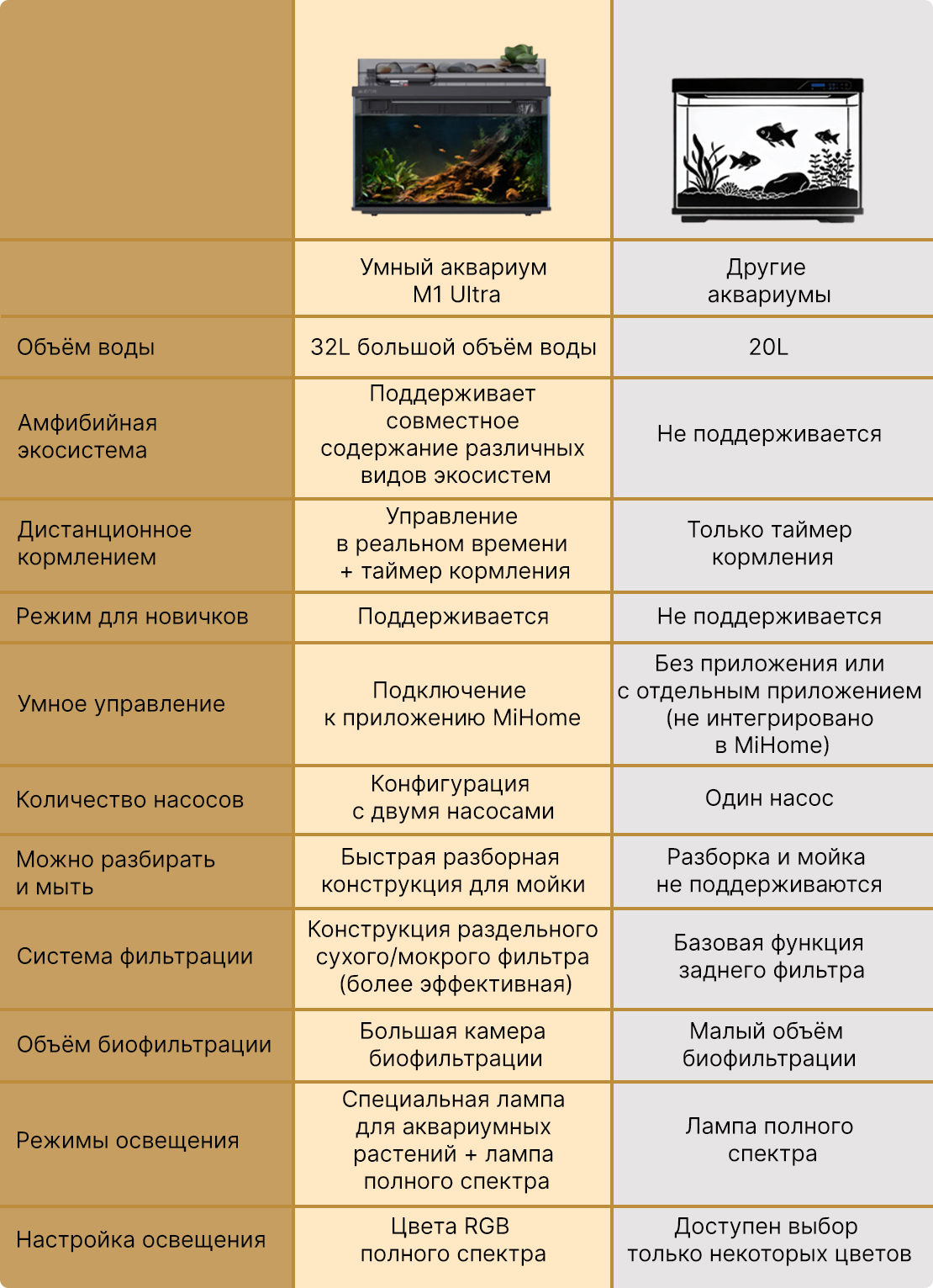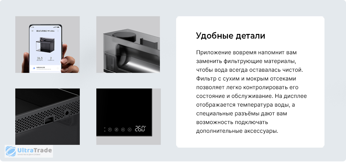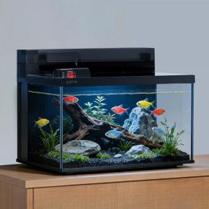Всё необходимое находиться в комплекте: достаньте аквариум, налейте воды — и можно запускать рыб. Встроенные системы — двойная фильтрация, автокормушка, подсветка и контроль температуры — возьмут на себя всю заботу о чистоте и комфорте.
