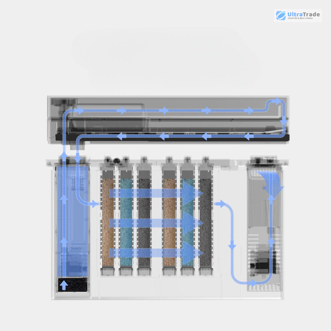 Аквариум использует 6-ступенчатую систему очистки: верхний слой со стальным ситом ловит крупный мусор, а нижние 4 слоя из специальных губок и биофильтров удаляют мелкие частицы, остатки корма и токсины.