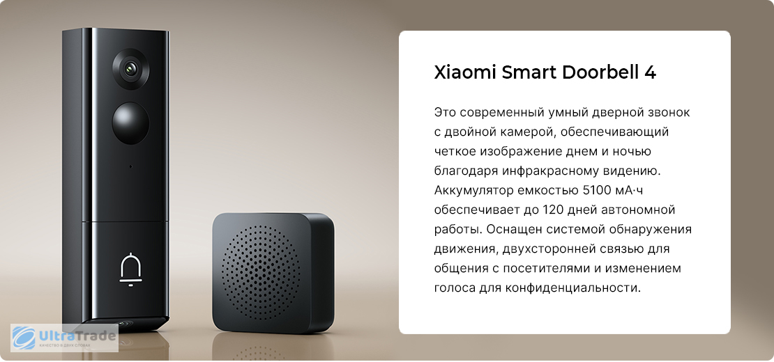 Звонок оснащен аккумулятором емкостью 5100 мА·ч, обеспечивающим до 120 дней работы без подзарядки. Благодаря оптимизированному энергопотреблению устройство работает экономично и надежно.