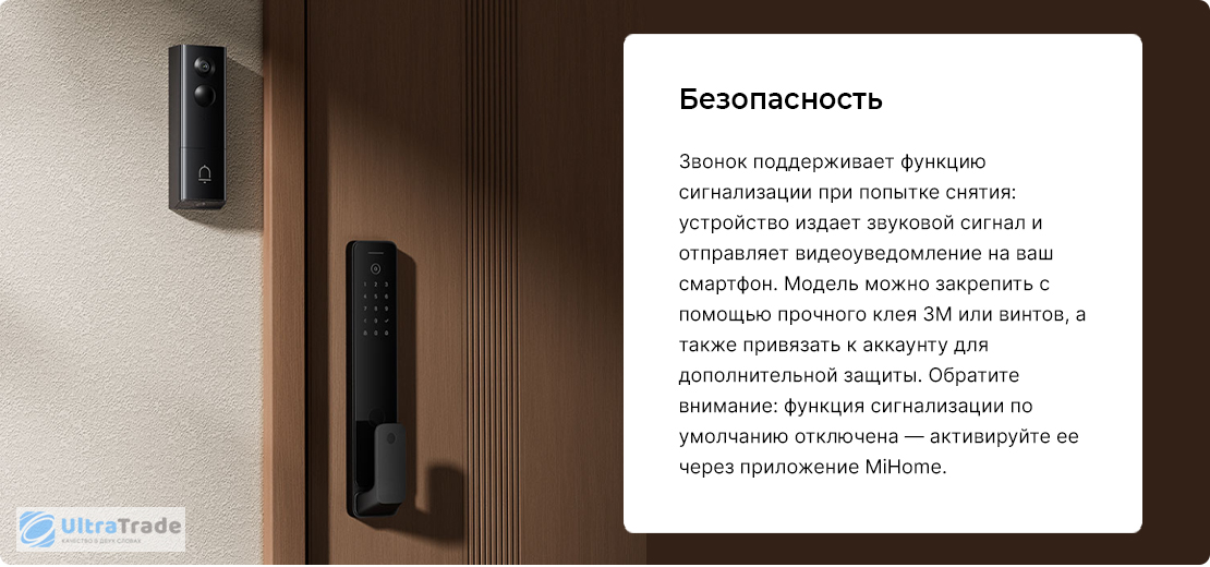 Дверной звонок оснащен чипом, который гарантирует безопасность ваших данных благодаря уникальному ключу и сертификату. Система использует шифрование AES-128, защищая передачу данных от несанкционированного доступа.
