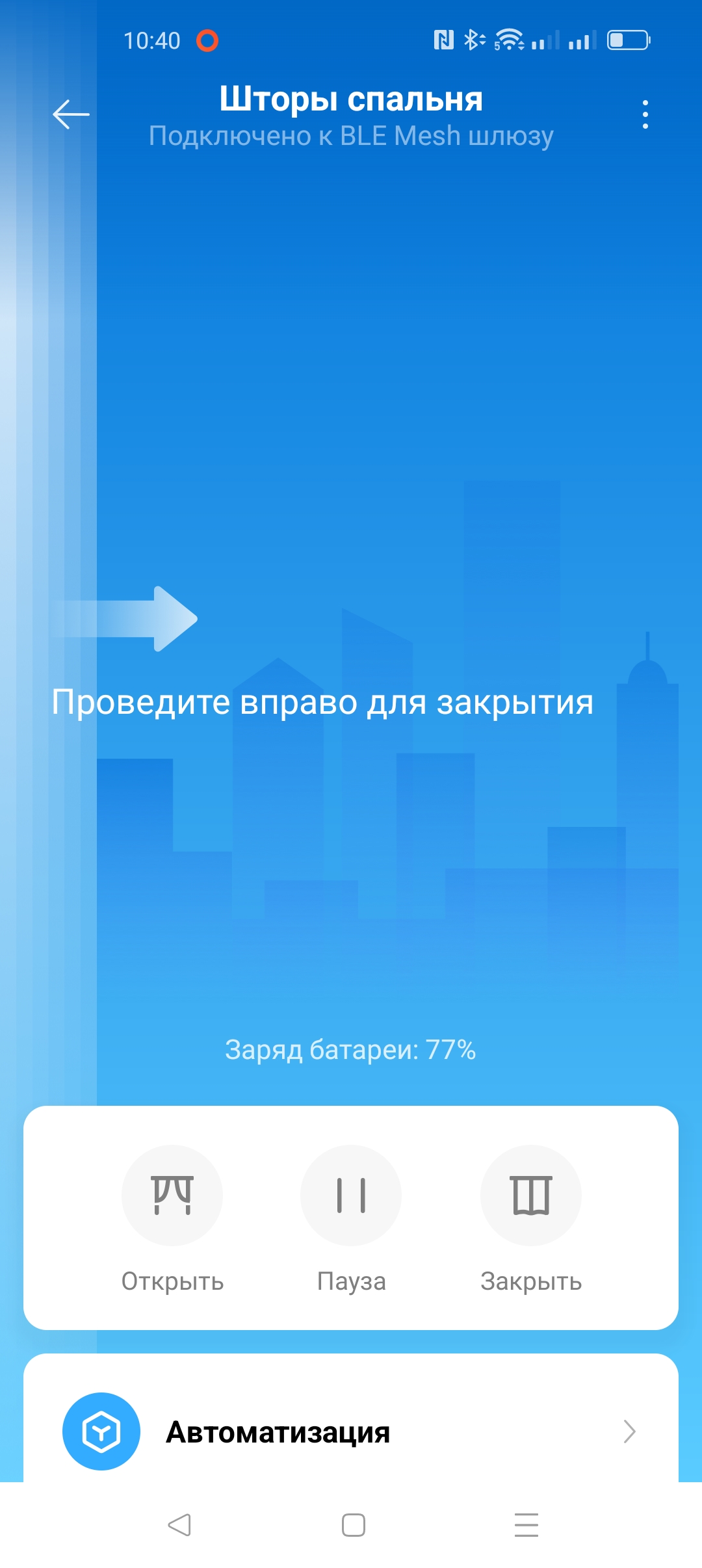 Беспроводное соединение Bluetooth Mesh позволяет синхронизировать работу устройства с другими умными гаджетами в вашем доме. Подключение к системе Умного дома позволит использовать различные сценарии работы. Можно синхронизировать работу электропривода для штор и умного светильника. Тогда при закрытии штор автоматически будет загораться искусственное освещение.