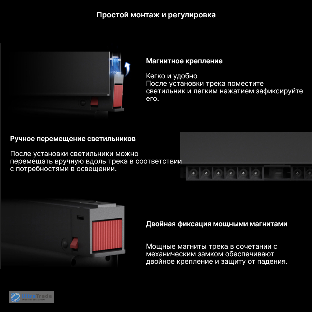 Все светильники крепятся на мощные магниты и могут свободно перемещаться по треку даже после установки. Питание 48 В постоянного тока обеспечивает безопасность, а двойная фиксация (магнит + механический замок) гарантирует надёжность. |