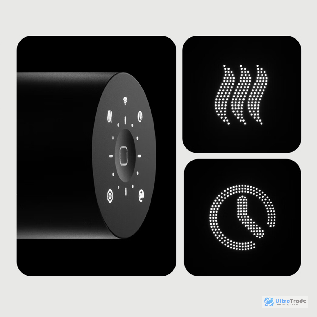 Интуитивный интерфейс и режимы сушки Полотенцесушитель оснащен инновационным бесшовным дисплеем, который органично вписан в корпус. На дисплее отображаются режим сушки, обратный отсчёт, 24-часовой таймер и настройки. Полотенцесушитель предлагает три режима сушки: деликатный режим (40°C–45°C), ежедневный режим (50°C–55°C) и антибактериальный режим (60°C–65°C). |