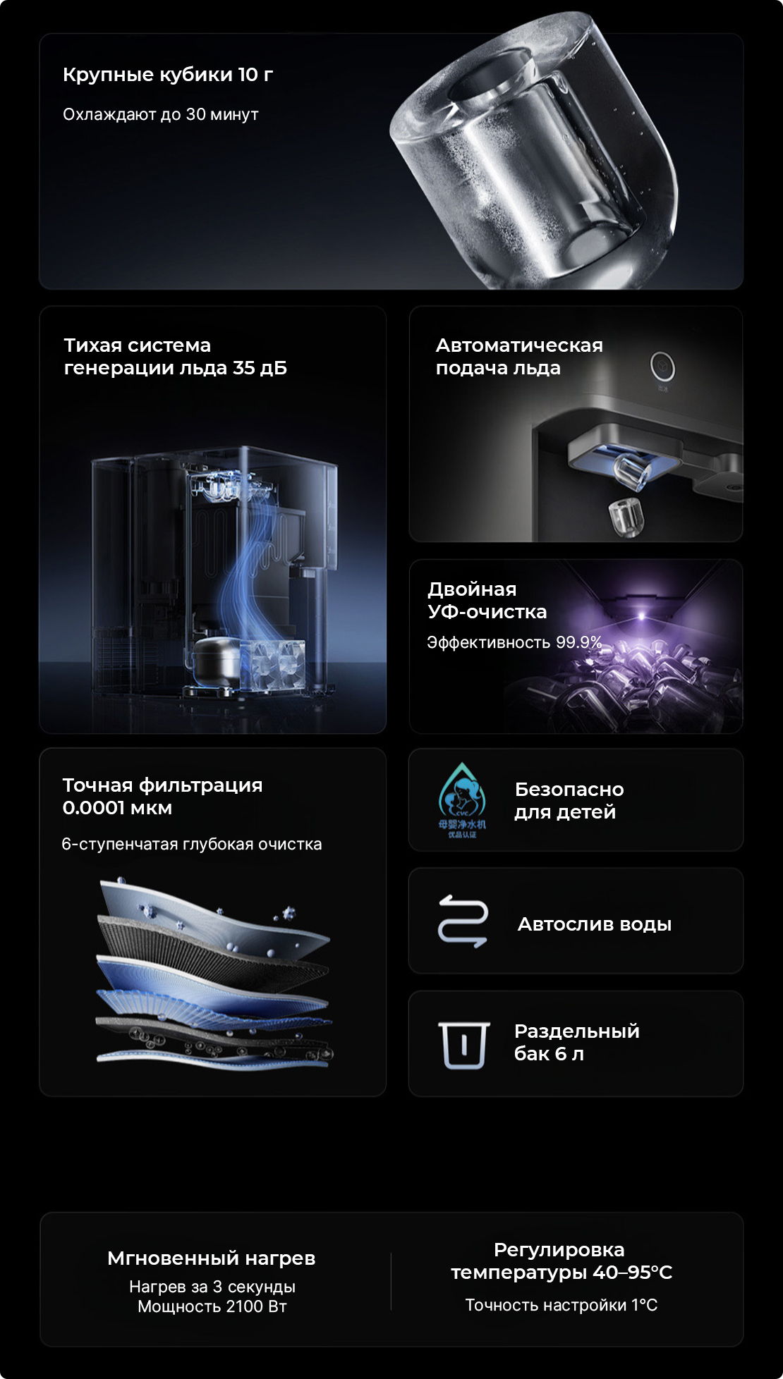 Тихая работа и два режима приготовления льда Технология инверторного компрессора и двойных вентиляторов обеспечивает не только эффективное приготовление льда, но и тихую работу на уровне 35 дБ. Система автоматически анализирует температуру и подстраивает мощность для стабильного результата. Вы можете выбирать между двумя режимами: стандартным — 5 кубиков по 10 г за 15 минут, или ускоренным — 5 кубиков по 6 г за 10 минут. Лед производится из очищенной воды, получается прозрачным, без трещин и пузырьков. Крупные 10-граммовые кубики тают медленно, сохраняя холод в напитках до 30 минут и не разбавляя их вкус. Такой лед идеально подходит для коктейлей, соков и других напитков, подчеркивая их насыщенный вкус. |