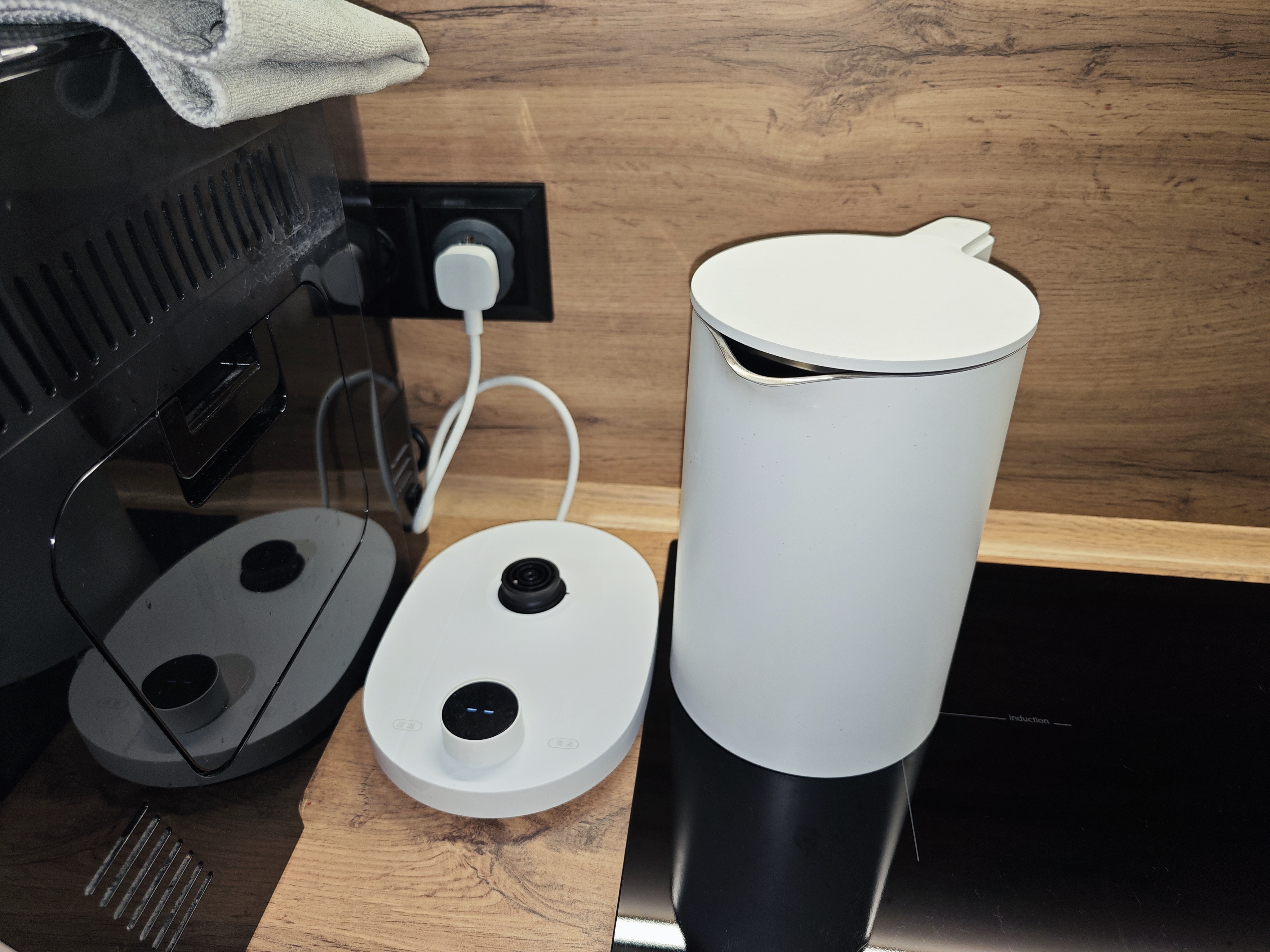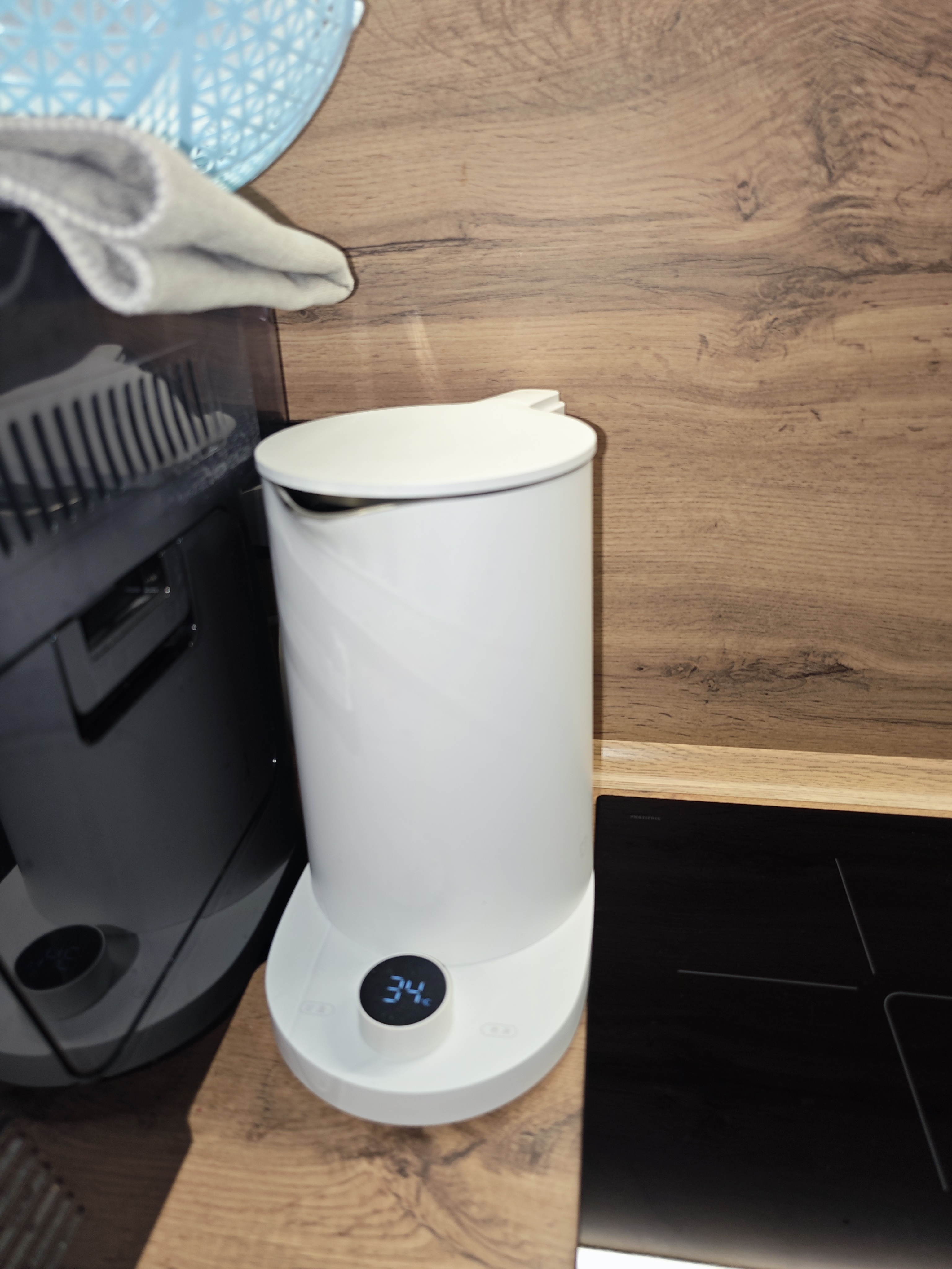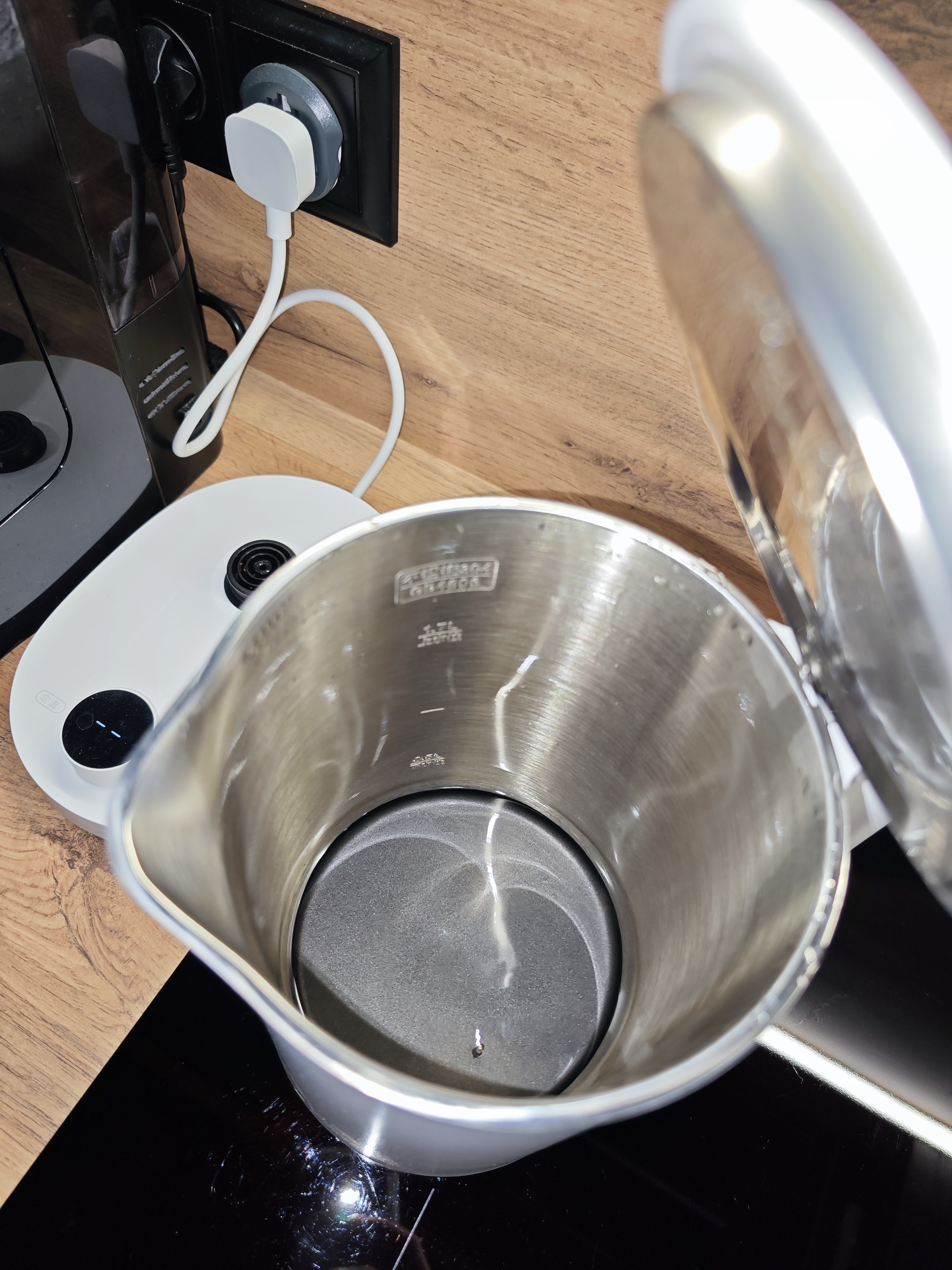 Чайник сделан из качественного толстого пластика. Внутри - термос. Есть возможность поддержания определенной температуры. Удобно утром включать через приложении и спускаться к уже горячему чайнику.