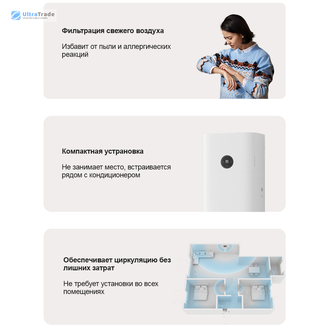 Это умный бризер, который может работать как самостоятельно, так и дополнять вашу систему климат-контроля. Пока кондиционер управляет температурой, бризер обеспечивает постоянный приток свежего, очищенного воздуха с улицы. Вместе они создают идеальный микроклимат,  комфортный по температуре и здоровый по составу. Это не альтернатива центральной вентиляции — это её доступная и компактная версия для квартиры или дома.