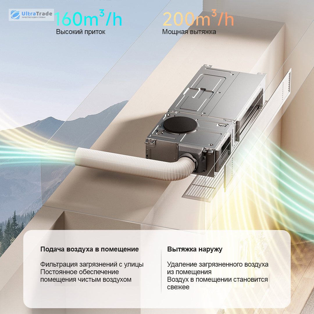 • Двухсторонний воздухообмен: одновременно подаёт 160 м³/ч свежего воздуха и удаляет 200 м³/ч отработанного. Это не просто приток, а полная замена воздуха в помещении.