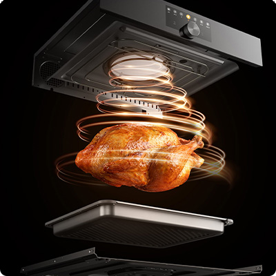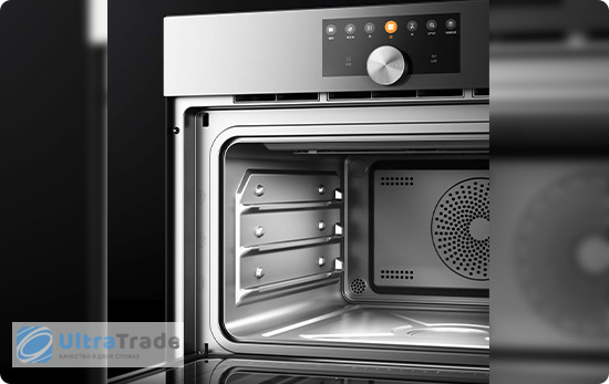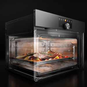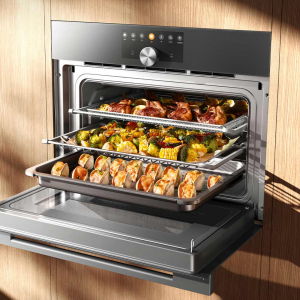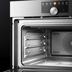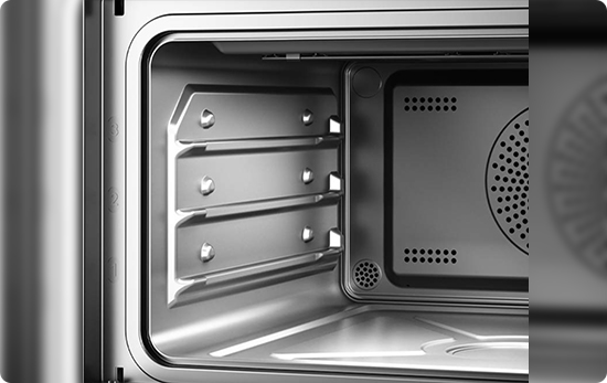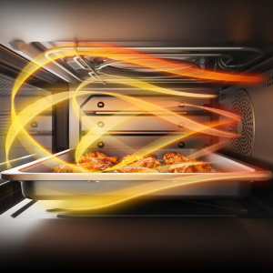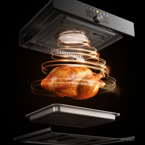 Кроме того, доступно восемь режимов запекания: обычная выпечка, 3D-запекание, профессиональный режим, интенсивный гриль, верхний и нижний обдув с жаром, конвекция с горячим воздухом, а также запекание с паром. |