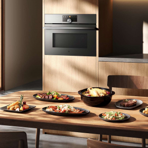 Свободное комбинирование режимов Духовой шкаф сочетает микроволновую и паровую технологии: микроволны равномерно прогревают продукт, сохраняя сочность внутри и обеспечивая хрустящую корочку снаружи, а пар быстро запечатывает влагу — особенно полезно для морепродуктов и овощей. В этой модели можно комбинировать функции для достижения нужного результата: