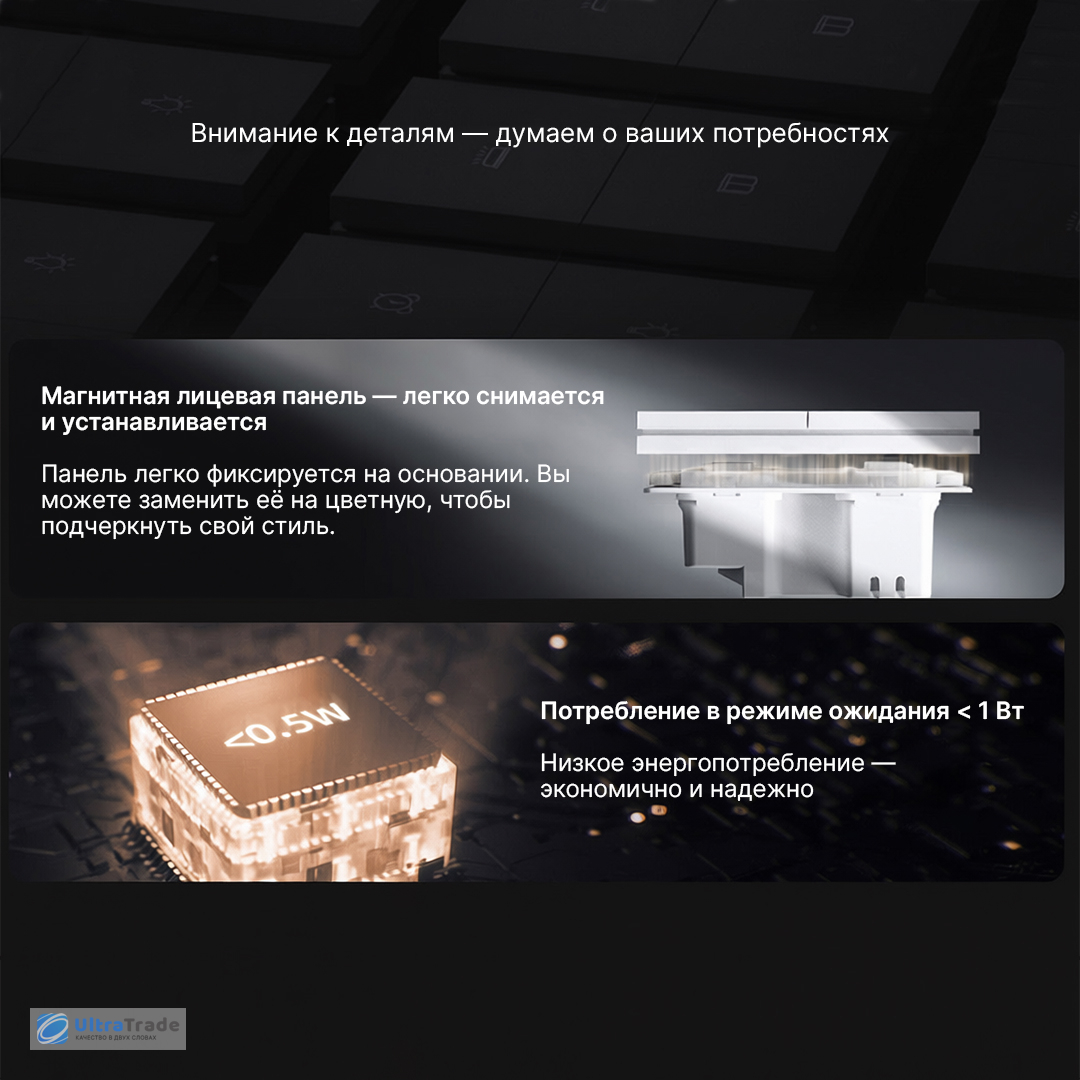 Дизайн Тонкий корпус 11 мм, глянцевая металлическая панель с лазерным узором, чёткие углы и симметричное деление — легко монтируется в ряд. Доступны два цвета: белый (слоновая кость) и серый (темно-космический). Материал устойчив к отпечаткам, окислению и пожелтению. ![]() |