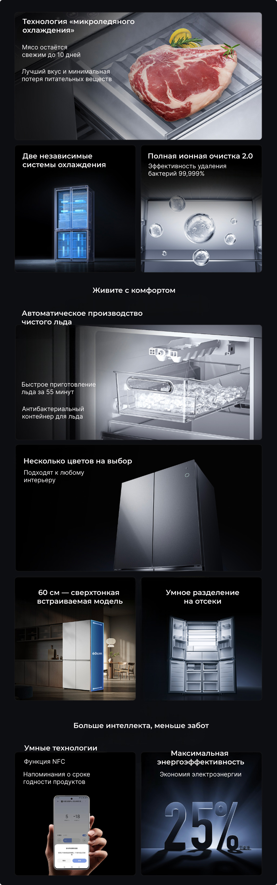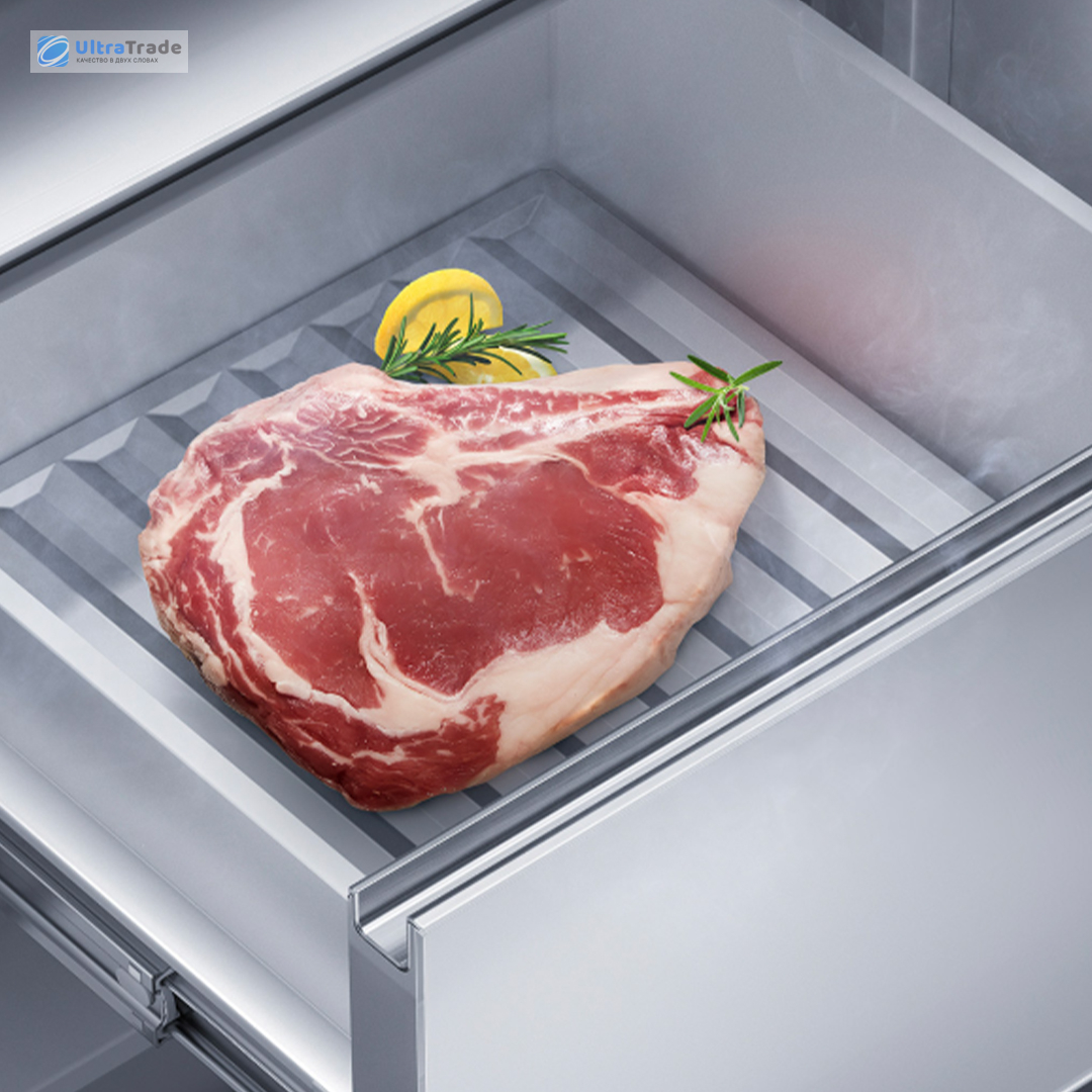 Современная технология «микро-льда» поддерживает температуру чуть ниже нуля, благодаря чему свежее мясо хранится до 10 дней без образования кристаллов льда. Такой бережный режим сохраняет естественную сочность и структуру продукта, минимизируя потерю влаги и полезных веществ.