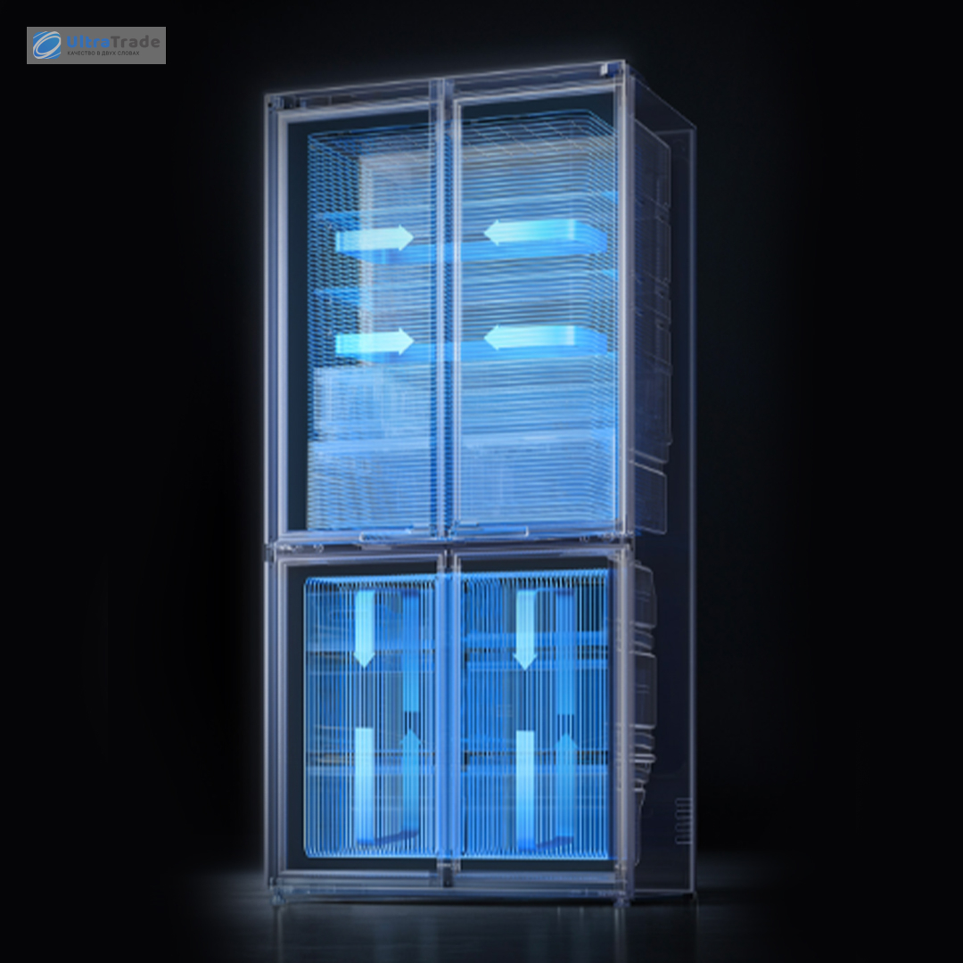 Холодильник оснащён системой двойного охлаждения с отдельными испарителем и вентилятором для холодильной и морозильной камер. Это обеспечивает независимую циркуляцию воздуха, предотвращая смешивание запахов.
